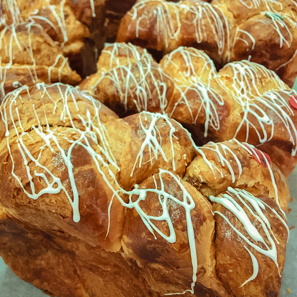 Хлеб имеет форму багета.